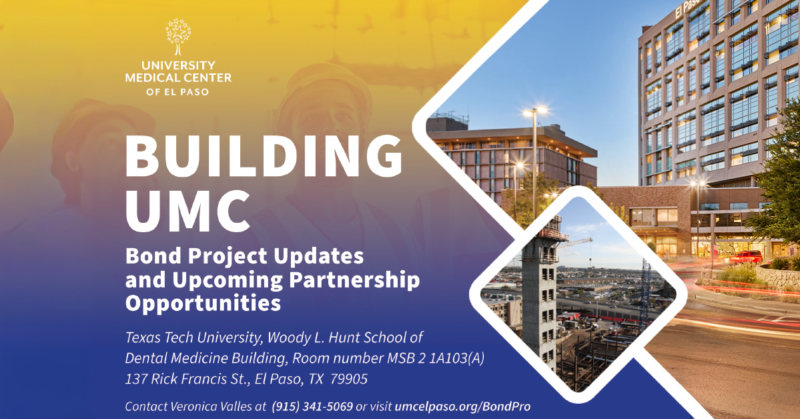 University Medical Center of El Paso invita a contratistas, subcontratistas y proveedores a asistir a una próxima sesión de actualización de proyectos del bono y oportunidades de colaboración.